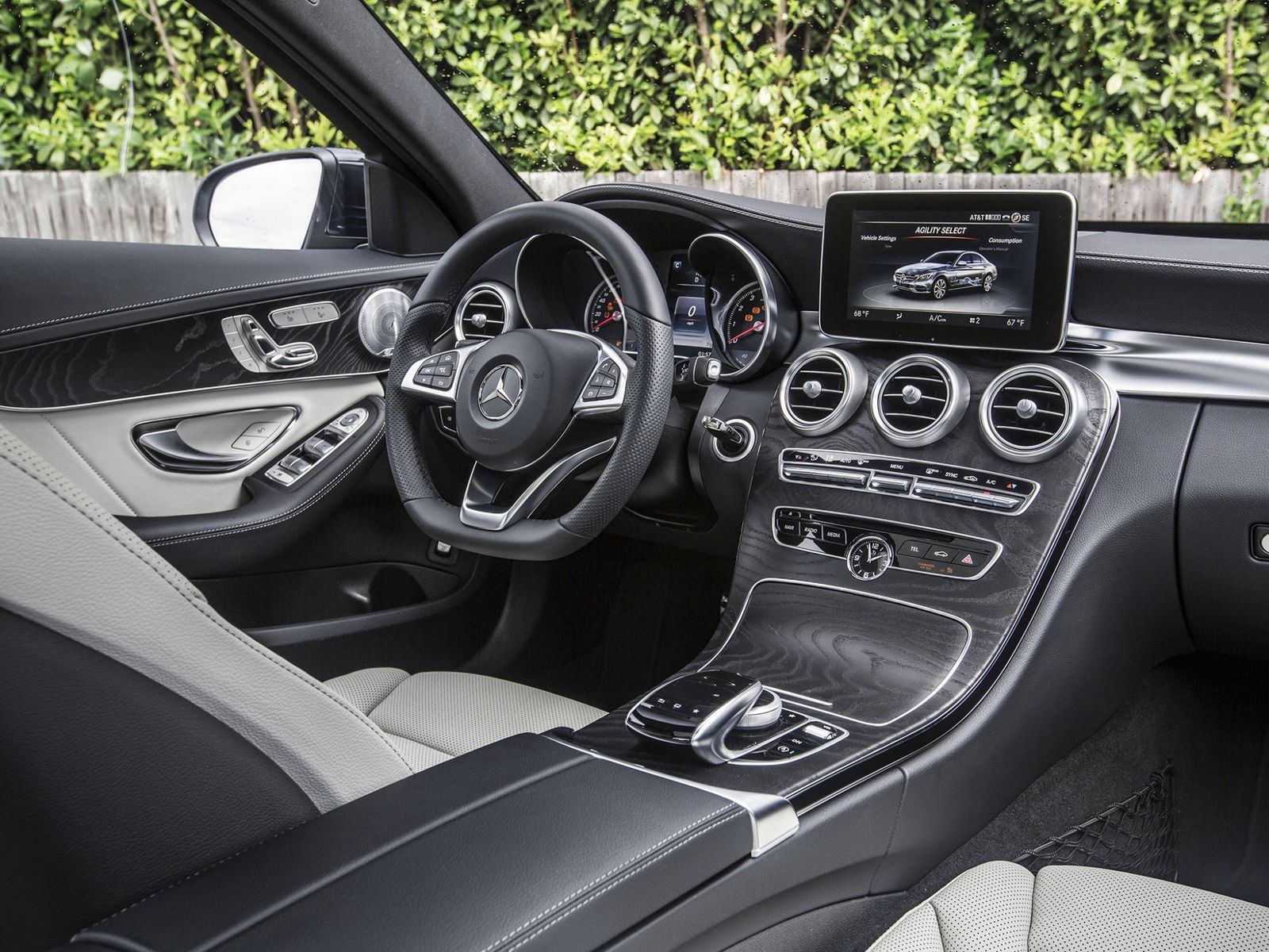 The W205 C-Class is equipped with the latest generation Comand infotainment system which pairs a 7-inch TFT color display positioned above the center console with a rotary controller on the center tunnel and a touchpad. Commands for the basic functions of the car are doubled by buttons on the center console, so you don’t have to browse through the menu if you don’t want to. That’s good, because the on-screen tabs aren’t as intuitive to access as the menus from BMW’s iDrive or Audi’s MMI. The basic sound system is impressive though, and pairing your phone to the car is very easy with the standard Bluetooth connection.